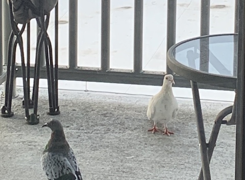 There it was – in all its glory - accompanied by a traditional silver pigeon, bobbing around on my balcony floor. They didn't fly away nor react to my sudden appearance.